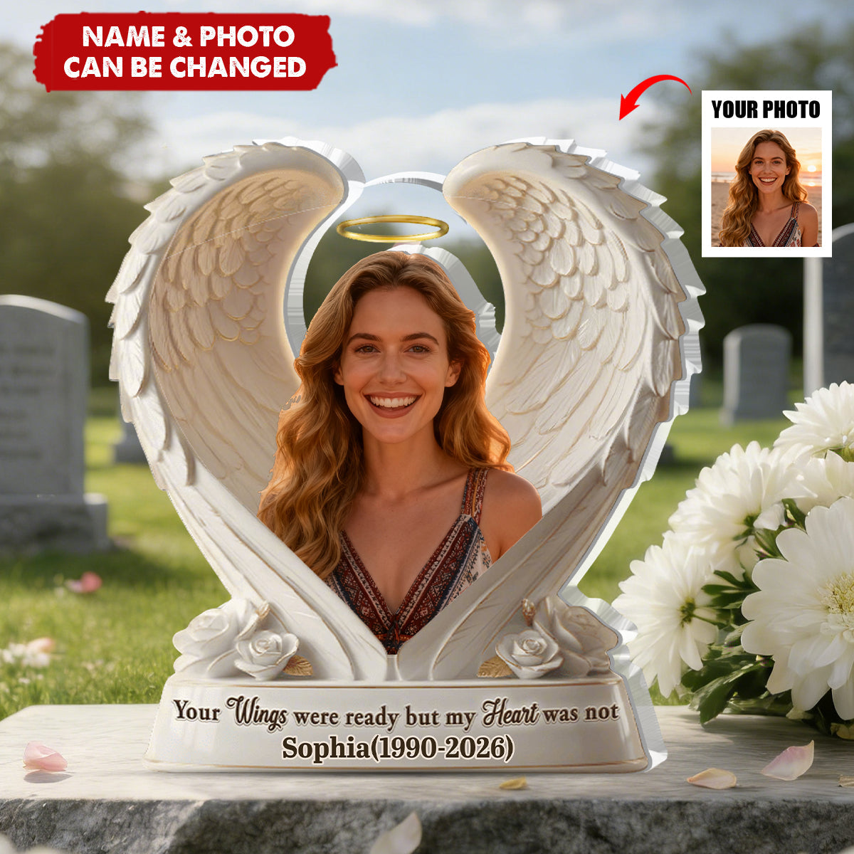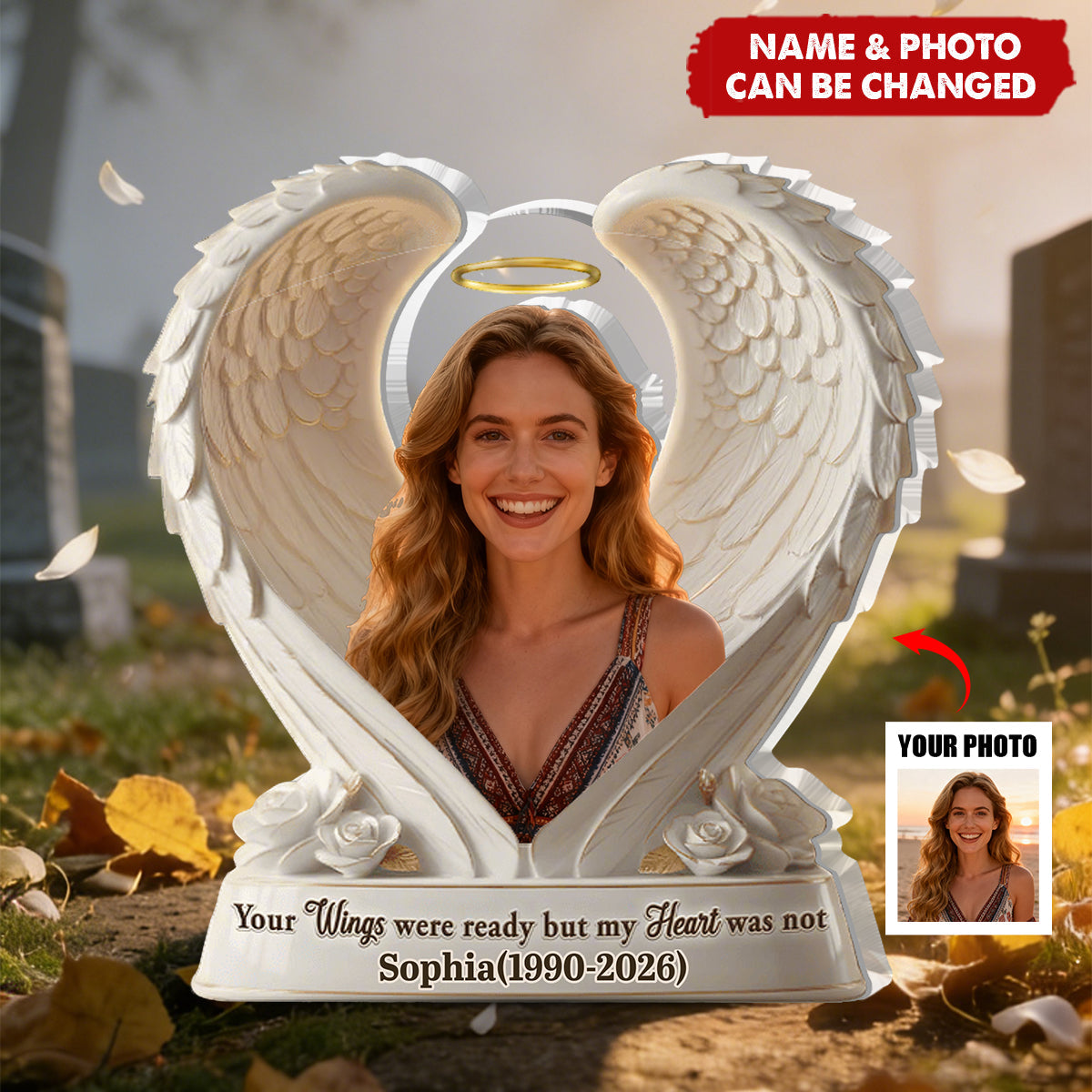 This custom-shaped acrylic plaque, etched with the tender message "Your Wings were ready but my Heart was not," is more than a keepsake—it’s a personal promise in physical form. Designed to sit where soft light can pass through it, it becomes a quiet symbol of presence and peace. Personalized with a name, it offers a daily touchpoint of comfort, a tangible whisper that love outlasts every goodbye.
